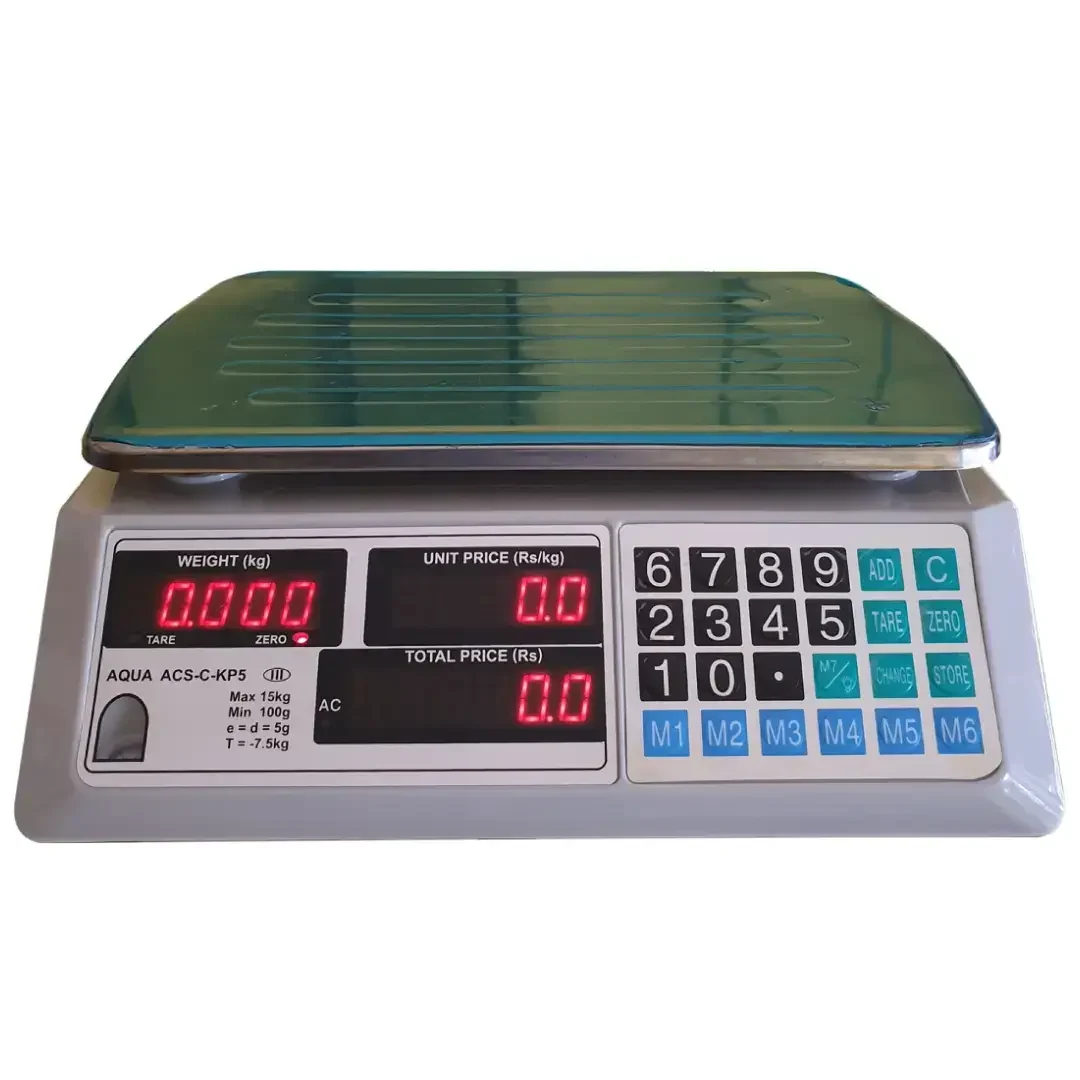Compact and reliable 15Kg AQUA ACS-C-KP5 digital weighing scale with 5g precision and bright LED display-ideal for shops and kitchens across Sri Lanka.
